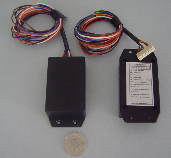 If the module trigger input is grounded (e.g. from a signal originating from a movement sensor) then the first warning message will play. If there are no further trigger events occurring within the next 15 seconds then the next trigger event will cause that same warning message to play at that time. If a second trigger event occurs with 15 seconds of the first then the module will play the second warning message. If a third trigger event occurs within 15 seconds after the 2nd event then the third message will play followed by a one second ground signal at the alarm trigger output. This output would normally be connected to an auxiliary input on the alarm module which will respond accordingly.